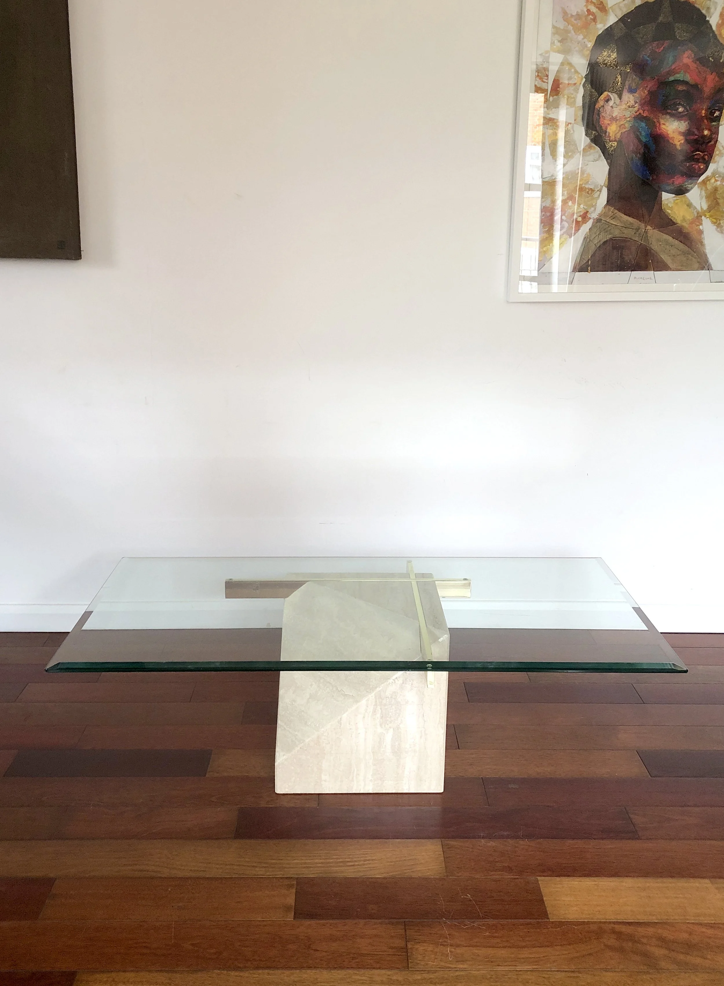 Italian Vintage Travertine, Brass And Glass Coffee Table, By Artedi , 1970s.
