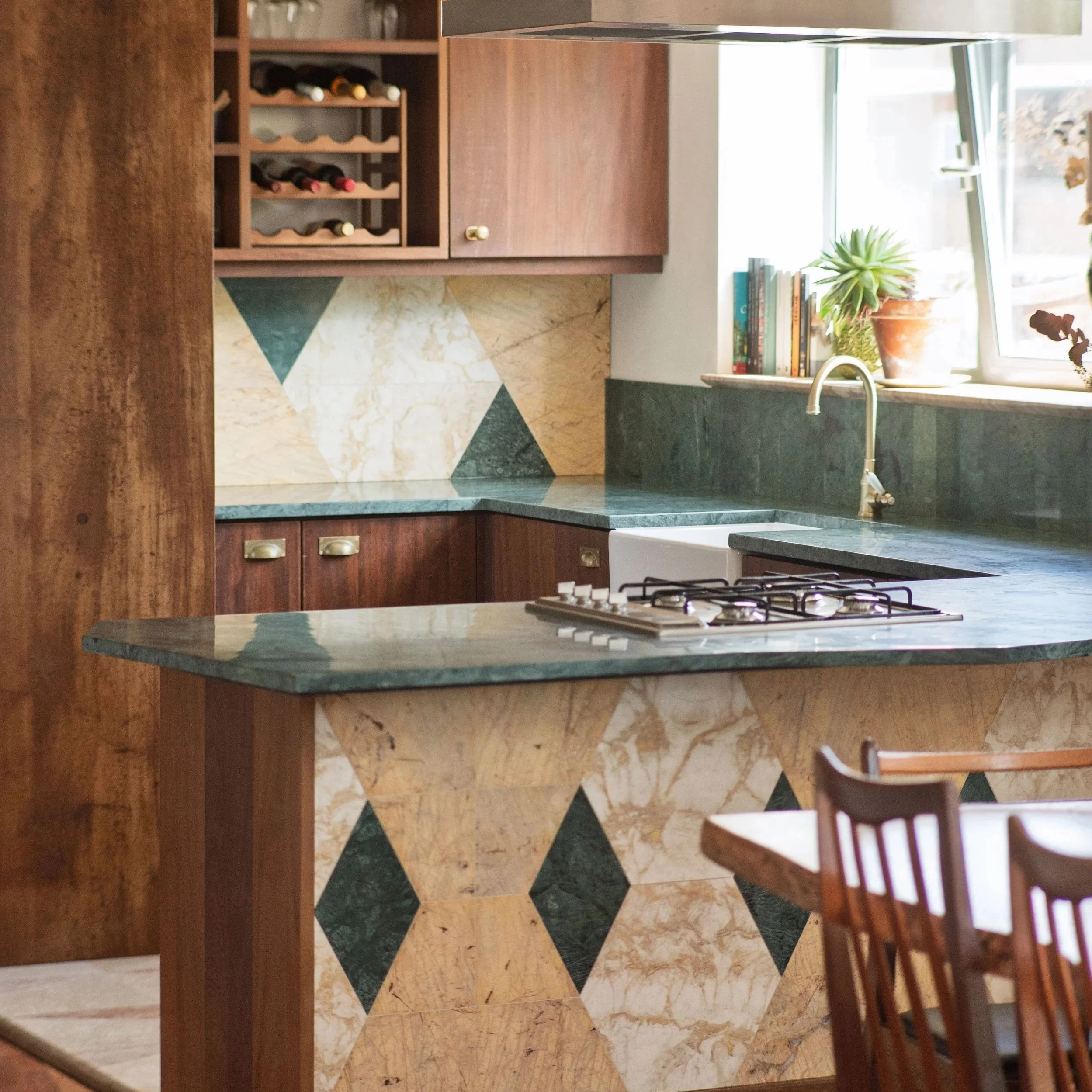 For this project, we blended a rich mix of our natural stone offcuts with reclaimed iroko lab-top and a selection of salvaged fixtures and fittings. -